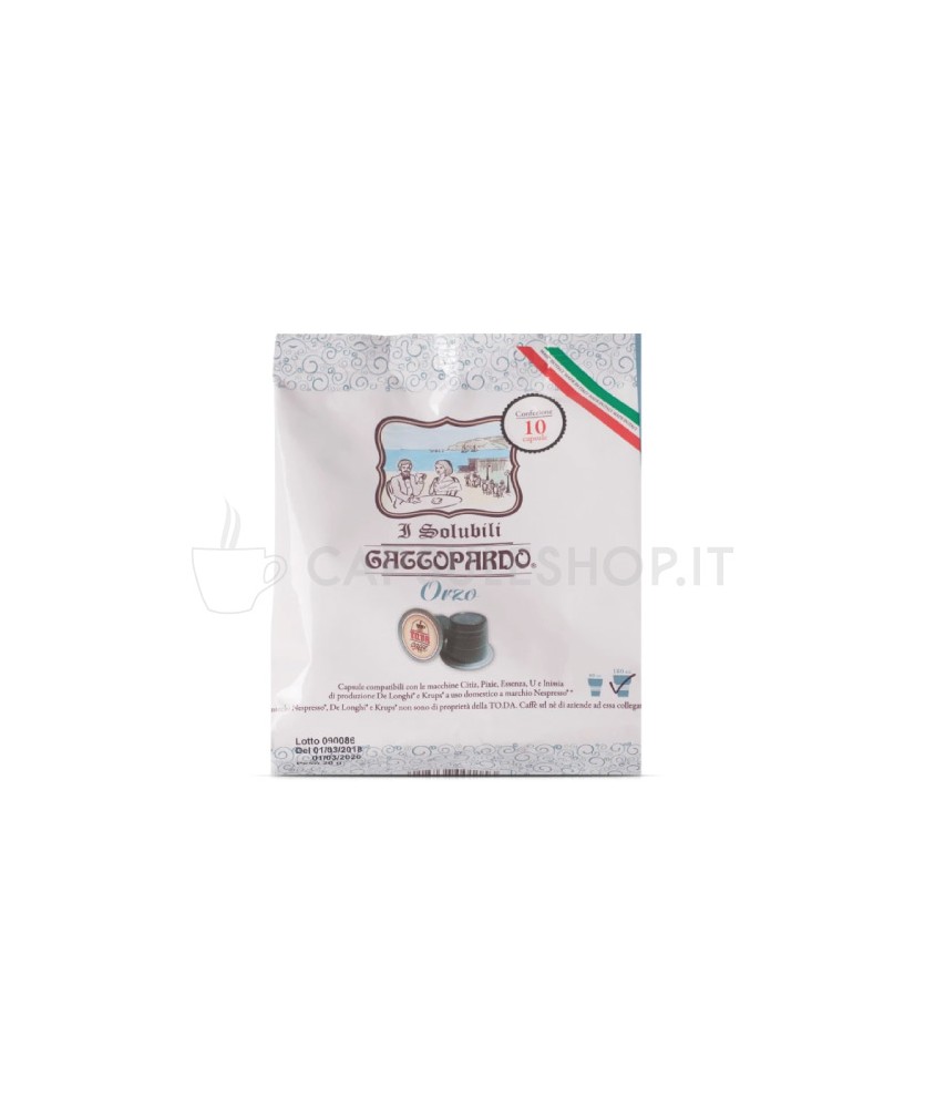 Nespresso-Gerste Kapseln von Gattopardo sind jetzt im eleganten Beutel mit 10 Kapseln erhältlich. Sie sind mit den meisten Nespresso-Maschinen kompatibel und bieten Ihnen in wenigen Augenblicken einen köstlichen Gerstenkaffee. Sie enthalten lösliche Gerste, die aus dem Toasten des gleichnamigen Getreides stammt.