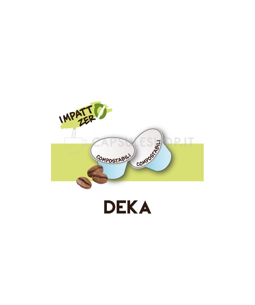 Capsule Nespresso decaffeinato 100% compostabili Le capsule Nespresso compostabili Deka sono la grande novità di Passione 88. Impatto Zero: le capsule che amano l'ambiente! Grazie alla composizione speciale della capsula, si possono gettare nell'umido. Deka è una miscela aromatica e raffinata, con un mix bilanciato tra varietà Robusta e Arabica. Ti regala un caffè espresso decaffeinato caratterizzato da dolci sentori di mandorla e cioccolato al latte, con note di frutta secca.   Caratteristiche e compatibilità  Le capsule compostabili della linea Impatto Zero sono confezionate in scatole da 50 capsule. Le capsule sono "autoprotette", il che significa che non necessitano di essere conservate in atmosfera protetta. CapsuleShop.it ti consiglia di mantenere le capsule caffè lontano da fonti di luce diretta o di eccessivo calore/freddo, per evitare il deterioramento degli aromi ed i sapori di questo caffè. Equivalenti alle originali, sono compatibili con tutte le macchine da caffè Nespresso e con la maggior parte delle macchine per capsule Nespresso.Se hai dubbi Verifica qui la compatibilità della tua macchina