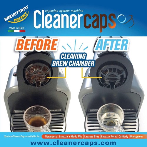 Cleaner Caps, le kit de désinfection pour le groupe café des machines à capsules Nespresso. Il nettoie et dégraisse uniquement la dernière partie de la machine à café sans affecter les pièces internes pour un meilleur café et pour une durée de vie plus longue de la machine elle-même.